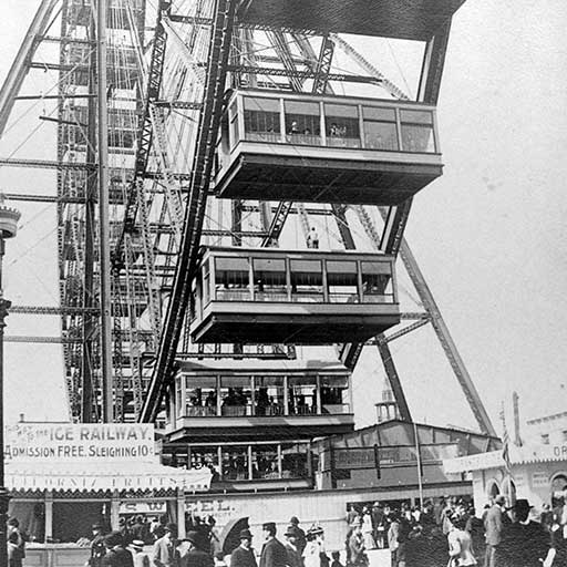Offered here are 16 virtual reality panoramas of the sites, assembling historical photography from the archives of the Chicago History Museum, the Chicago Public Library, the Ryerson and Burnham Archives at the Art Institute of Chicago, and the Goodyear Archival Collection at the Brooklyn Museum Archives. The virtual reality video experience, linked in the menu, provides an animated ride on the central feature of the Midway: the 250 foot Ferris Wheel.